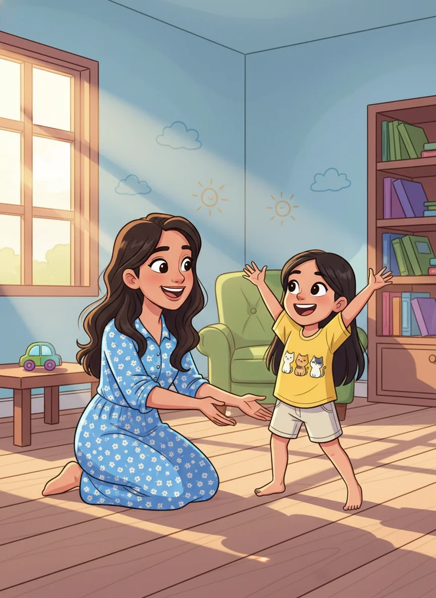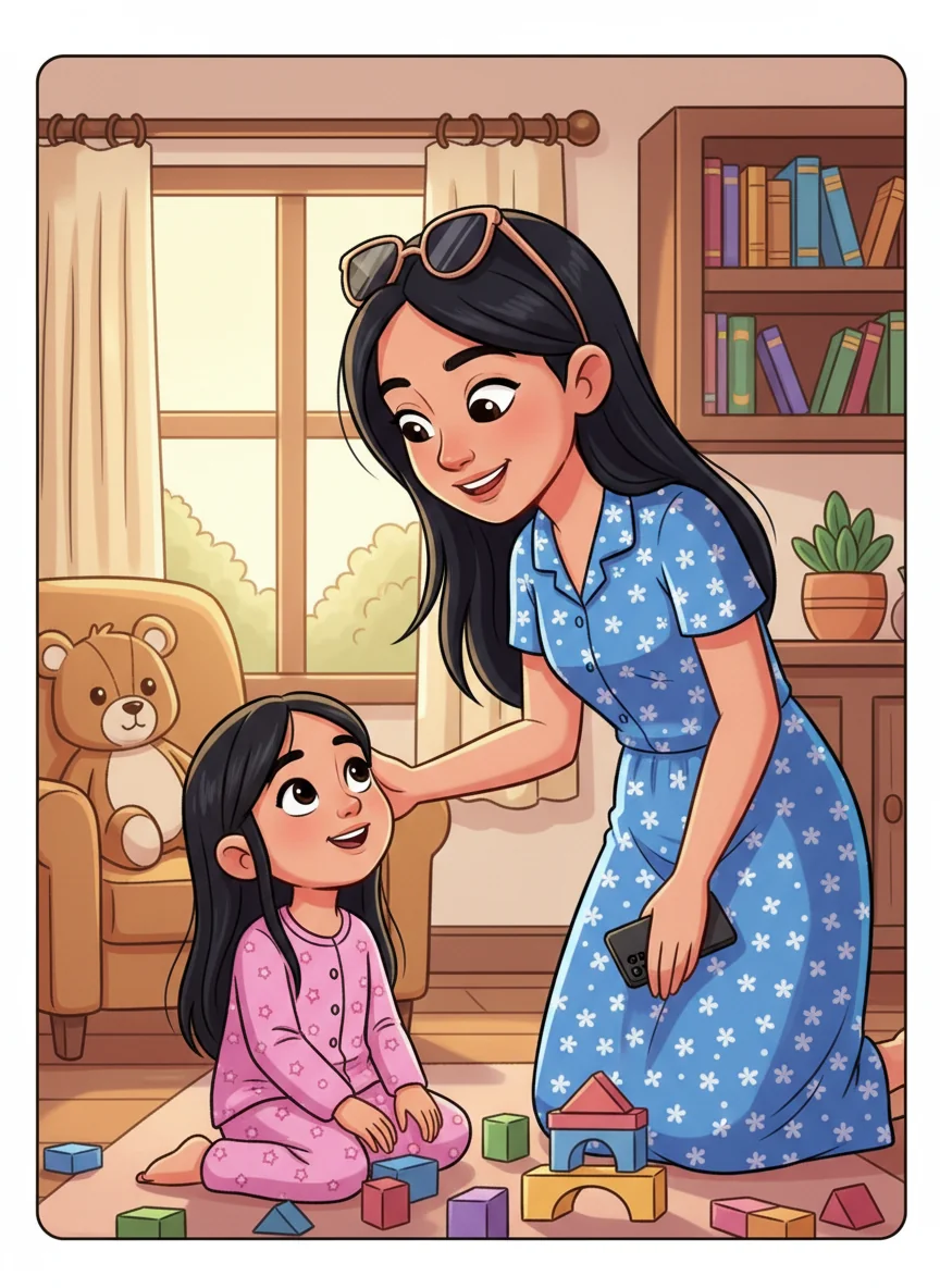 Mommy, with her long, dark brown hair, wore a cheerful blue dress with little white flowers. She smiled warmly at Alula, who was ready for a fun day. "Good morning, sunshine!" Mommy greeted.