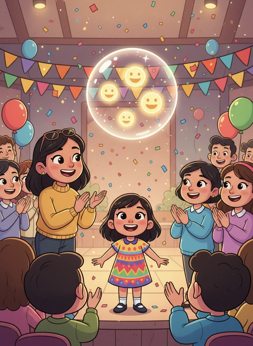 Everyone clapped when Alula finished, and a big, happy feeling bubbled inside her. Mommy beamed, proud of her brave girl. Alula learned that sharing her joy, even on a day that started sad, brought happiness to everyone.