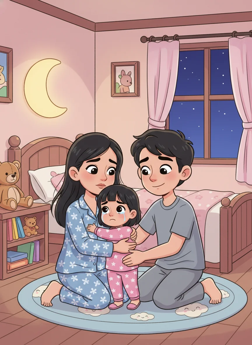 "Oh no!" Alula whispered, her lip starting to tremble. "Will you and Daddy come with me?" Mommy hugged her gently, her warm, dark almond-shaped eyes showing sadness too.
