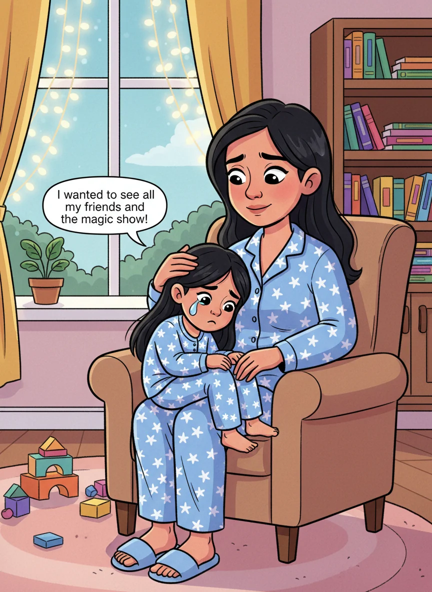 A tear rolled down Alula's cheek. "I wanted to see all my friends and the magic show!" she cried. Mommy smoothed Alula's hair, her heart feeling heavy.