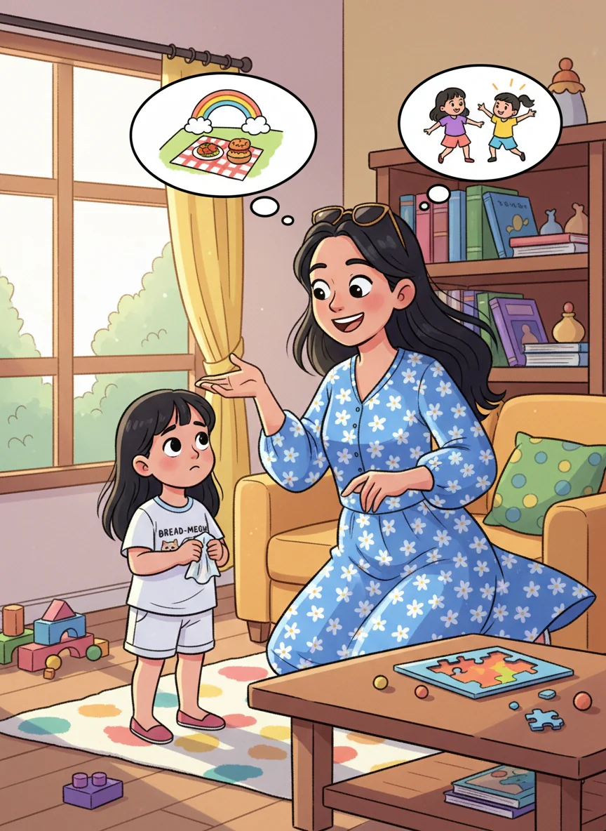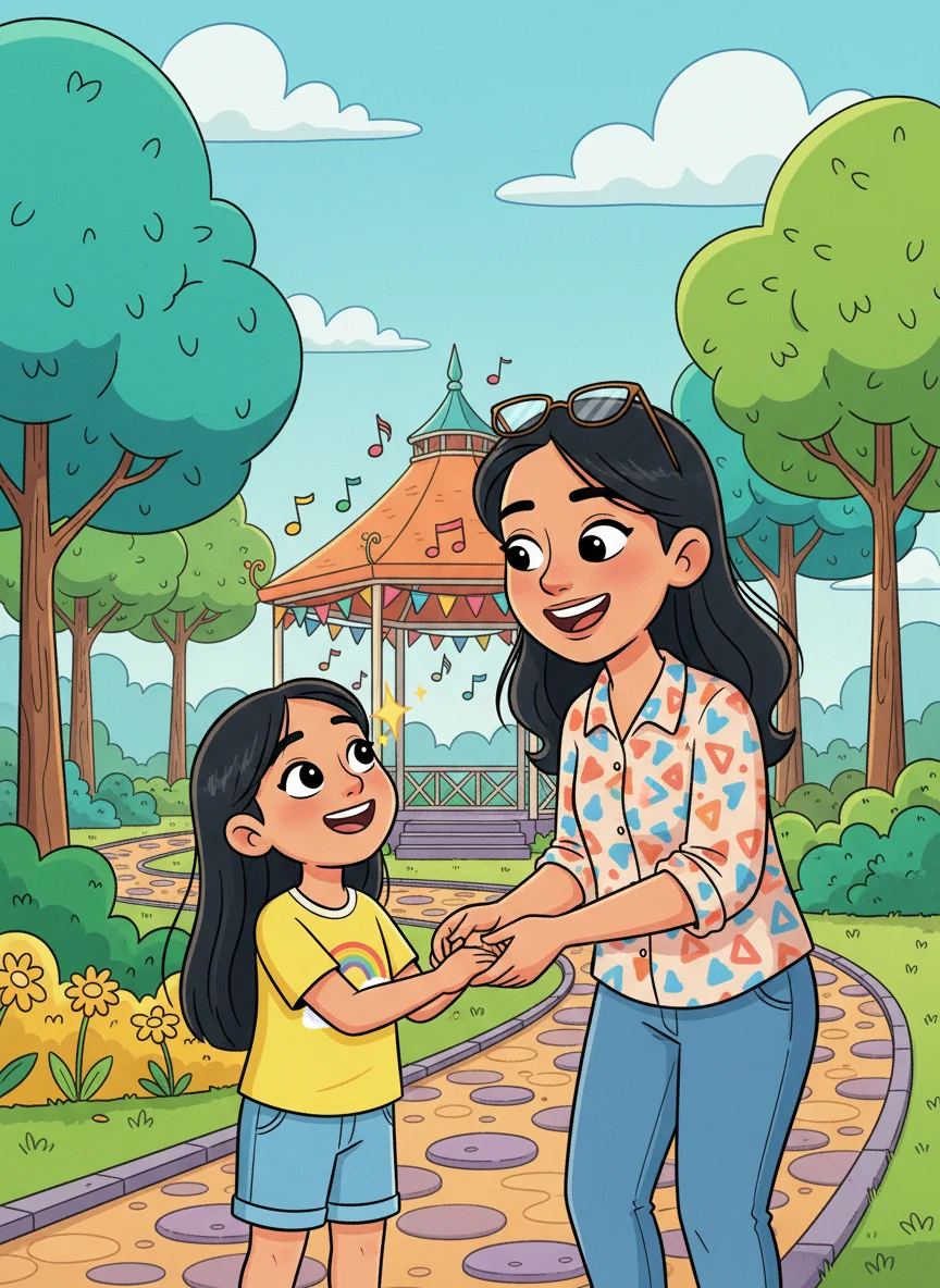 "I know it's hard, darling," Mommy said, thinking quickly, her cheerful blue dress swaying. "But we can still make today special, just you and me!" She had a wonderful idea.