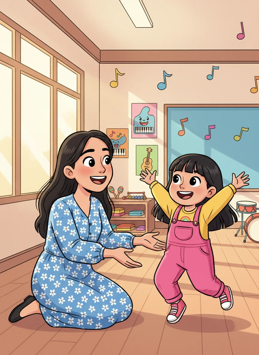 At singing class, Alula felt a bit shy at first, but then she remembered Mommy's kind words. She chose her favorite happy song and began to share her beautiful voice. The happy melody filled the room.