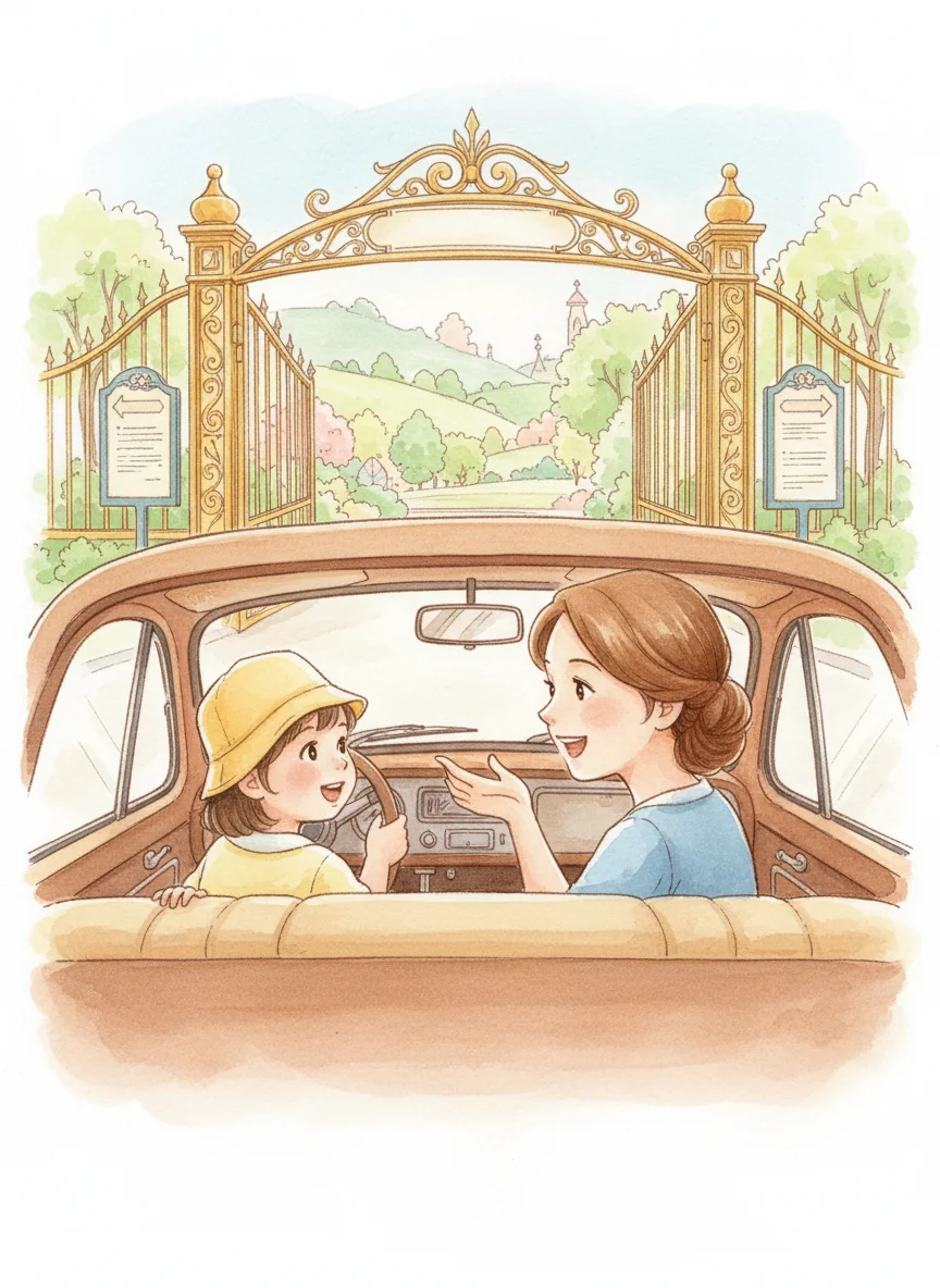 The car hummed a happy tune as they drove. Soon, they saw big signs and tall gates. 'We're here, Eil!' said Mama, smiling brightly.