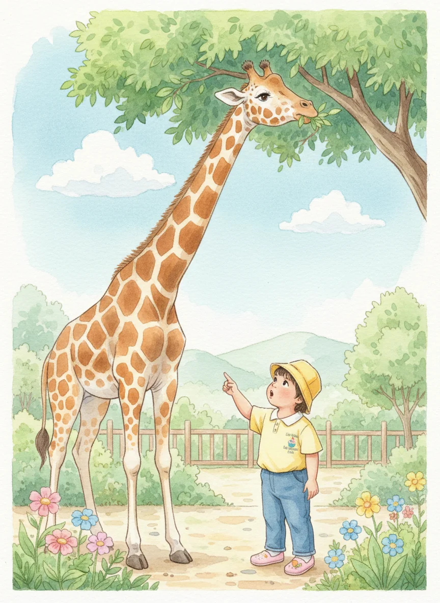 Inside the zoo, Eil saw amazing animals. First, a tall giraffe munched on leaves from a tree. 'Look how long its neck is!' Eil whispered in awe.