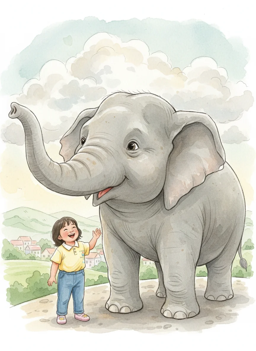 Next, a giant elephant swung its trunk gently. It was so big and gray! 'It looks like a friendly cloud,' Eil giggled.