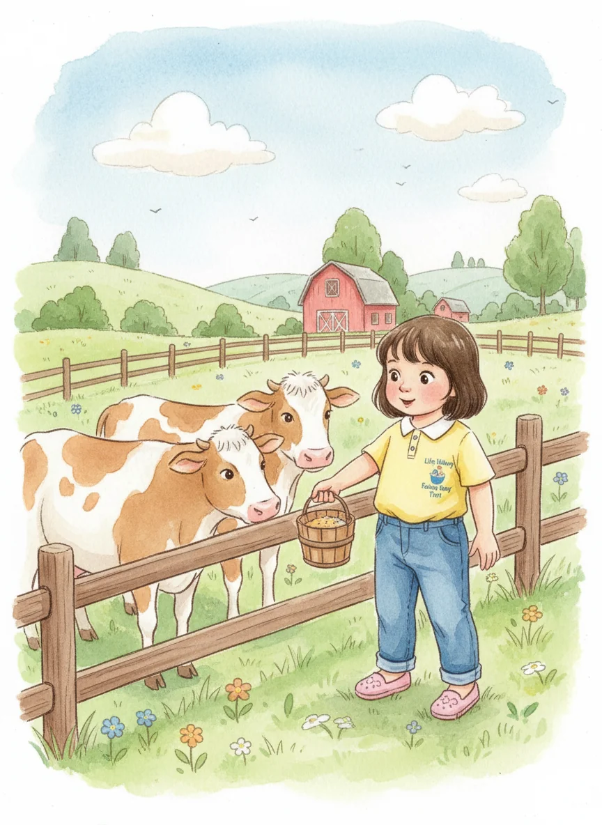 Then, they came to a farm area. Eil's eyes lit up when she saw some cows. 'Can I feed them?' she asked, feeling brave.