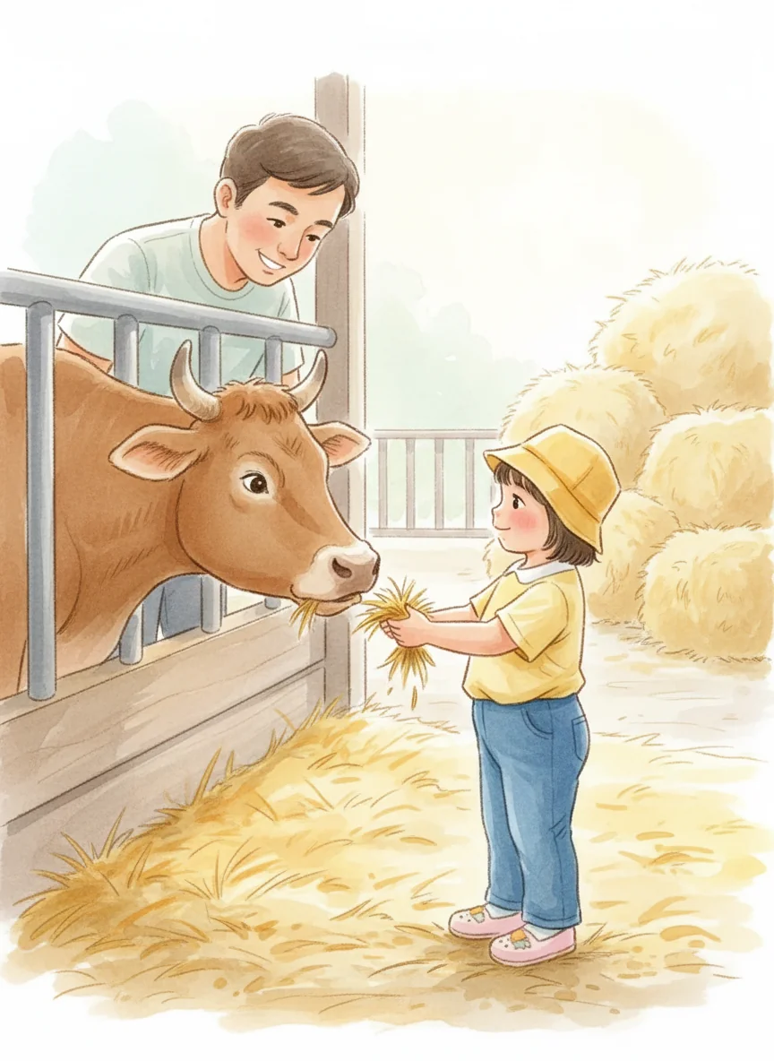 Papa handed Eil some fresh hay. A cow gently took the food right from her hand! Eil felt a warm, happy feeling inside.