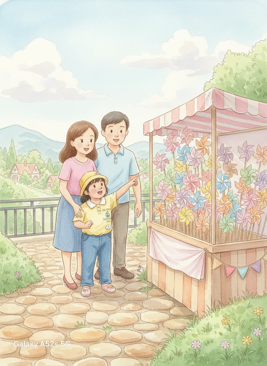 As they walked, Eil saw a colorful stall. Pinwheels of every color spun in the breeze! 'Mama, Papa, I want one!' she exclaimed, pointing.