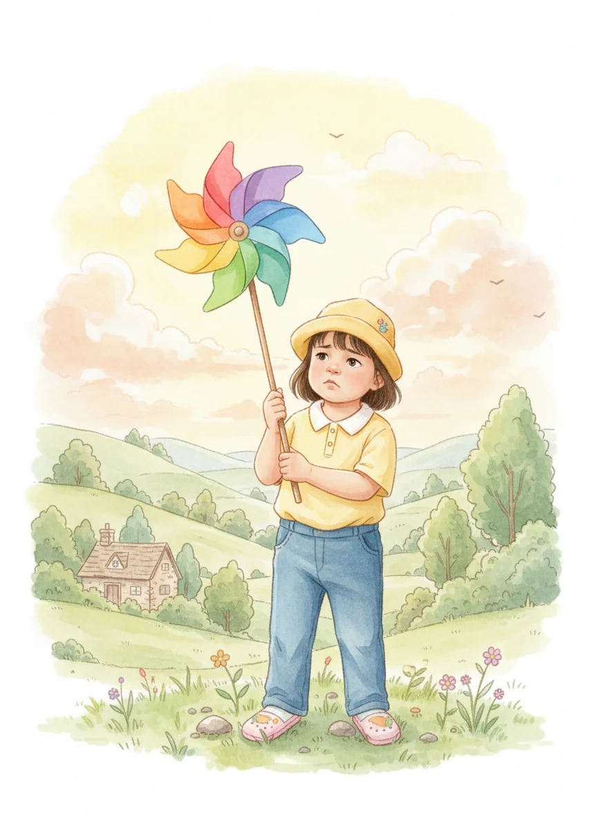 Eil chose a bright rainbow pinwheel. She held it up, but it stayed perfectly still. 'Oh, why won't it spin?' she wondered, a little disappointed.