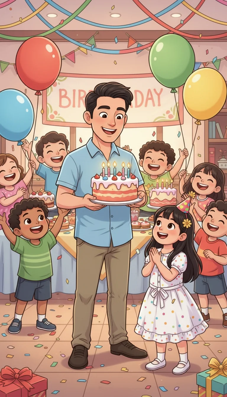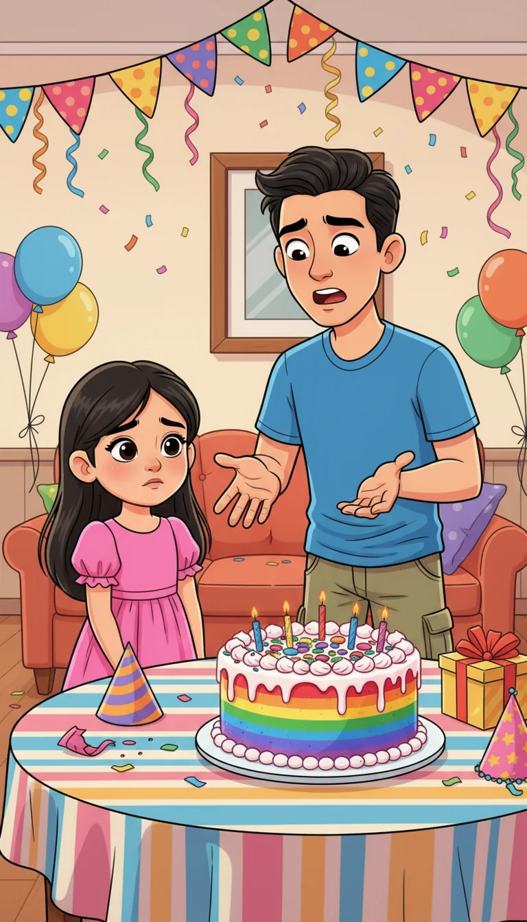 "Oh no!" Dad exclaimed, his dark eyebrows furrowing. "The big, rainbow birthday cake! It's not here!" Rona's happy smile slowly faded, and her almond-shaped eyes looked sad. How could they have a party without the special cake?