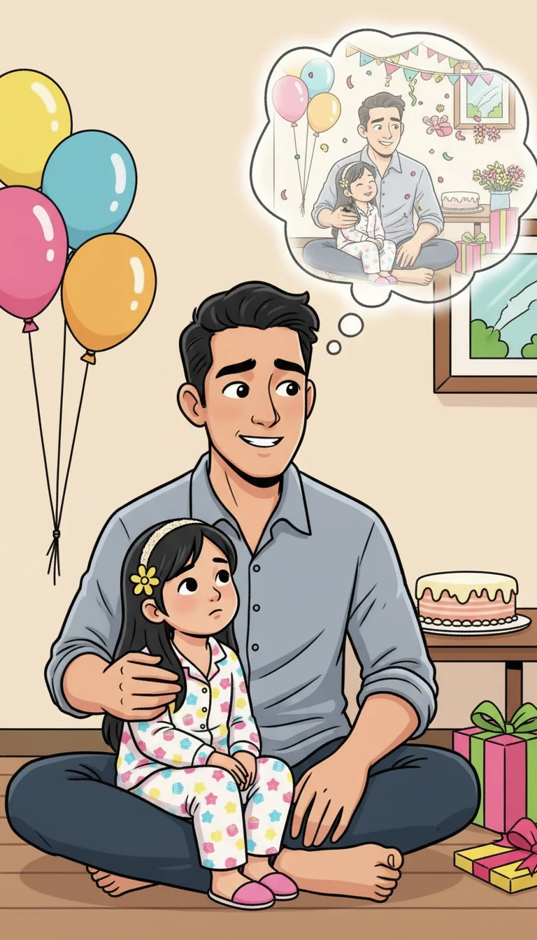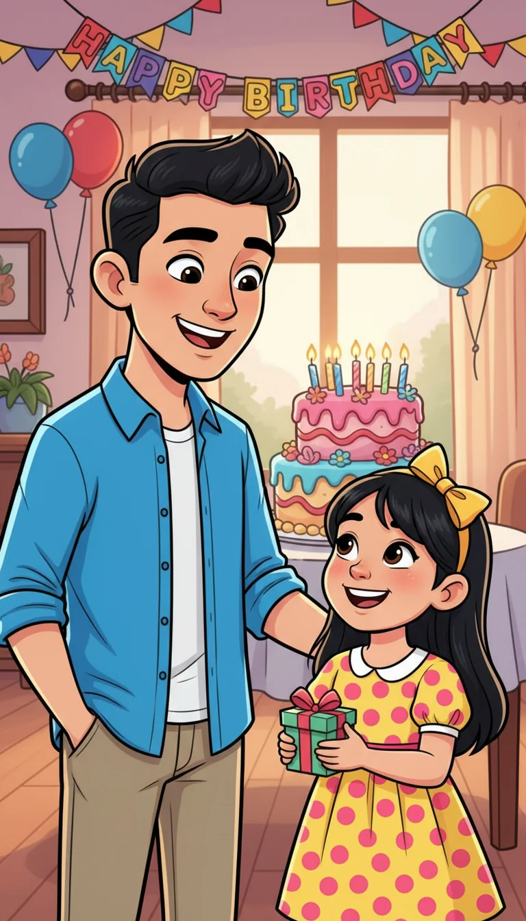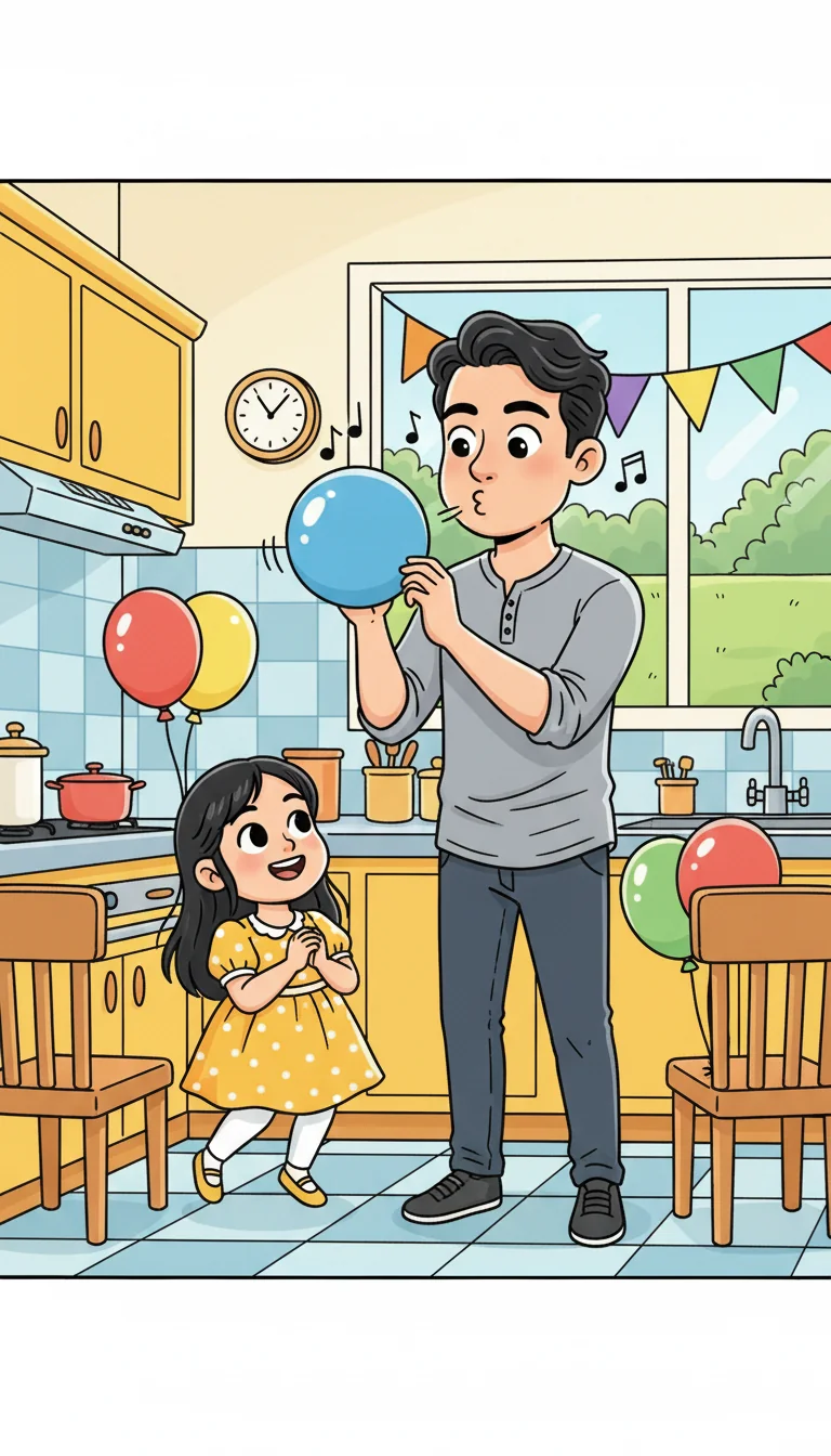 Dad, with his neat wavy hair and a heather grey shirt, was busy in the kitchen. He hummed a happy tune while blowing up colorful balloons. Rona bounced with excitement, "Are my friends coming soon, Papa?" she asked.