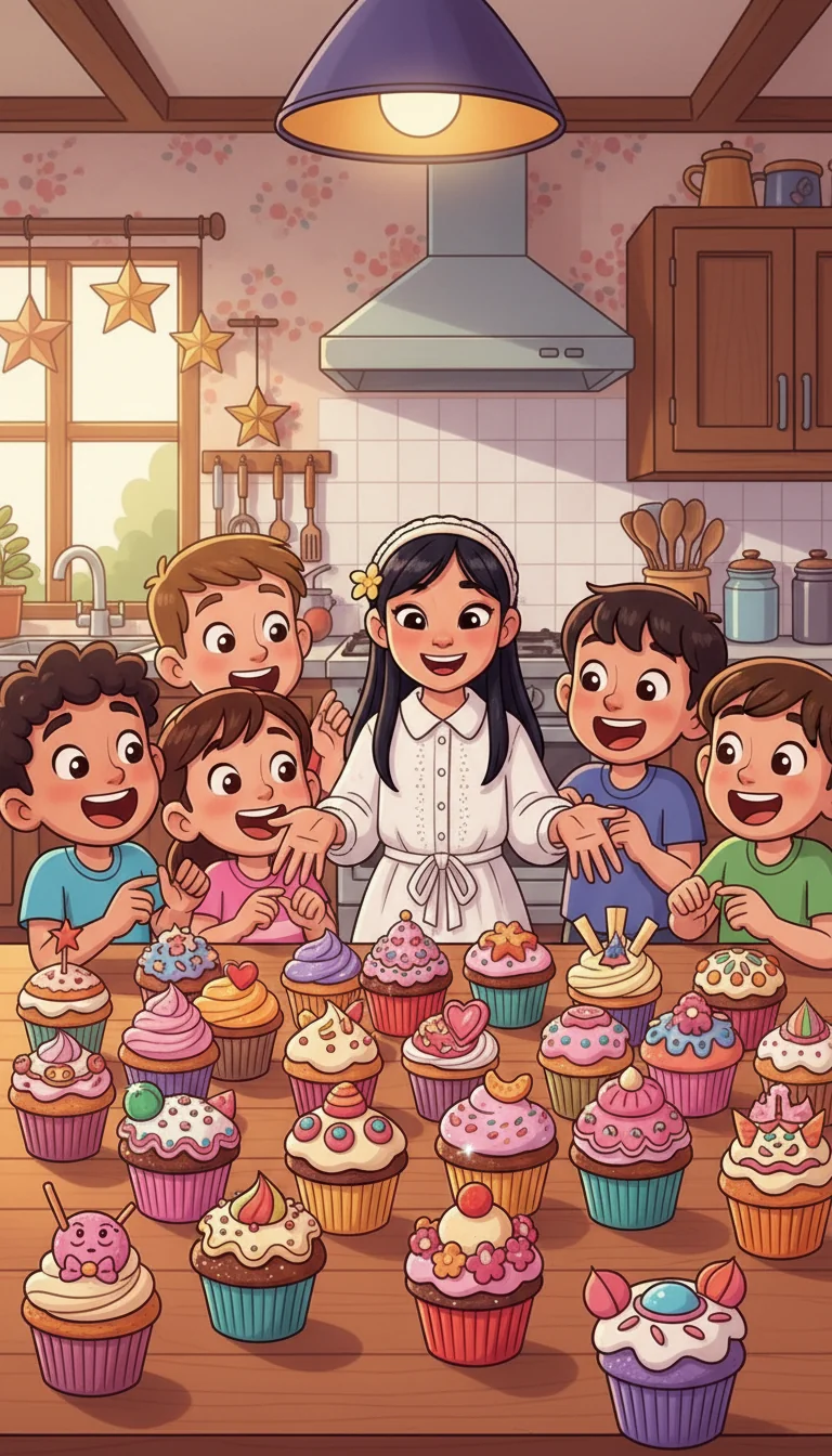 Soon, the kitchen counter was full of bright, sparkly cupcakes, each one unique. Rona's friends gasped with delight. "Wow, these are amazing!" they cheered, picking their favorites. The party was saved!